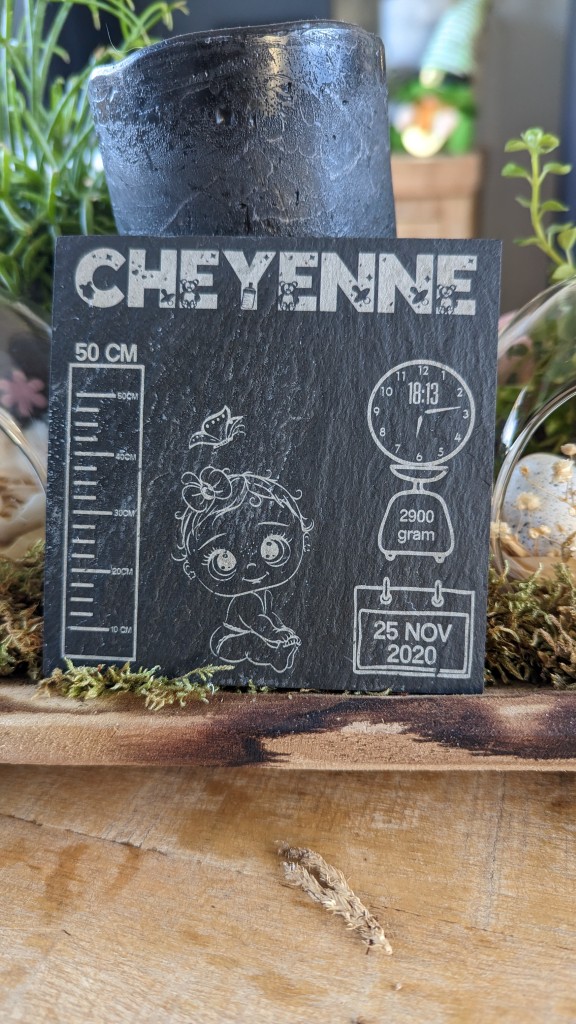 Een blijvende herinnering aan de geboorte. Deze leisteen tegel van 15 x 15 cm graveren we met de naam van je kindje en alle geboortegegevens. Denk aan datum, tijd, gewicht en lengte. Je kunt er ook een icoontje, tekening of een klein symbool bij zetten. Door de natuurlijke structuur van leisteen krijgt elke tegel een eigen, unieke uitstraling.